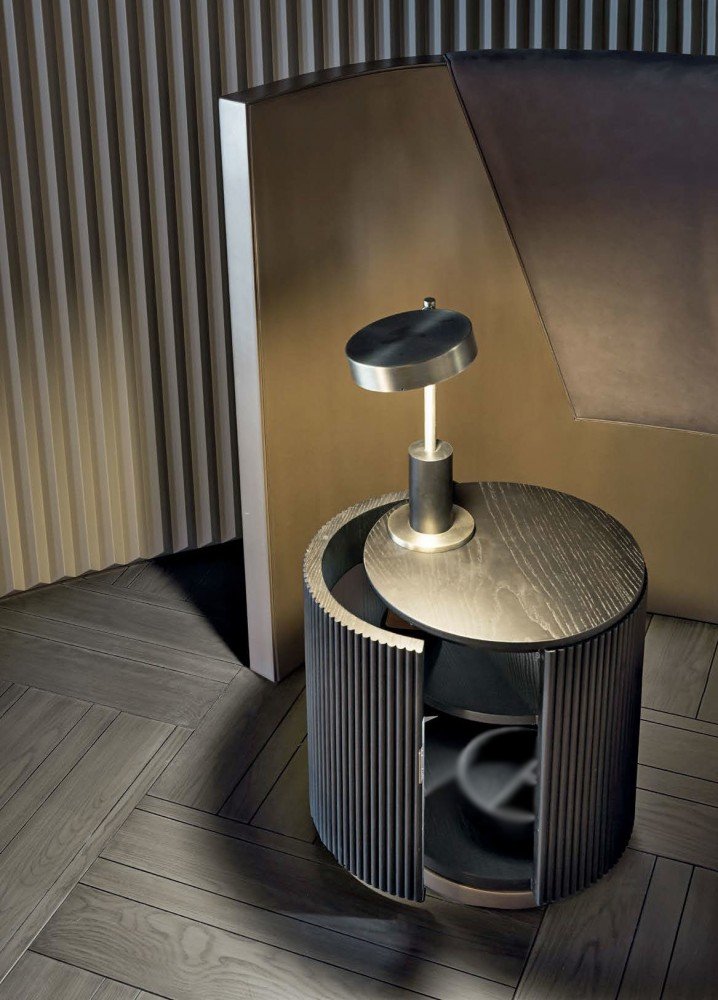 Tapizado piel Cat.D, respaldo contrachapado fresno estriado, zócalo MDF dorado
